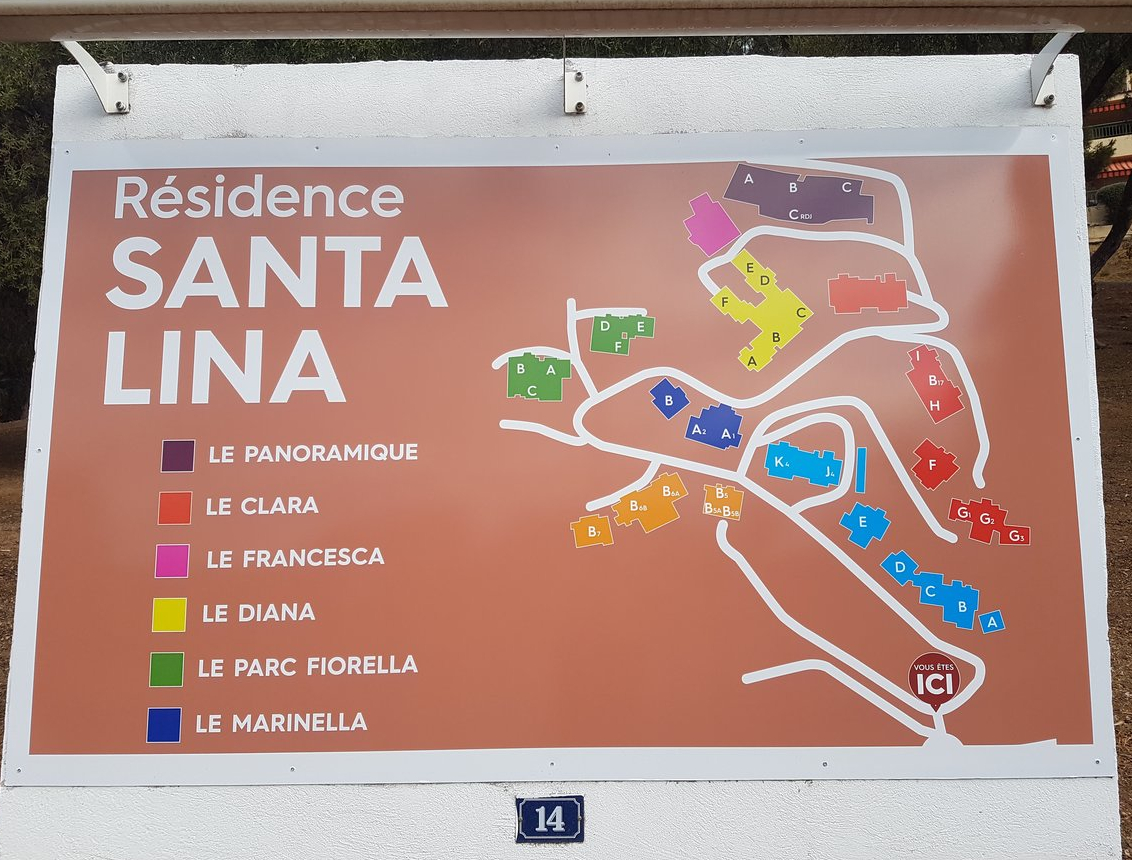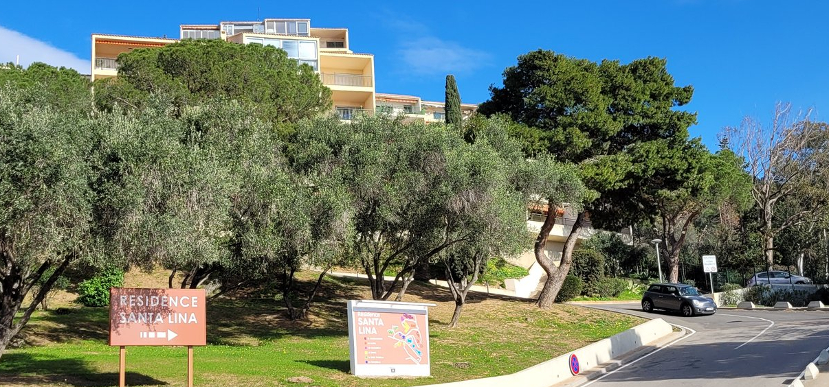 La résidence Santa Lina est située à environ 5 kilomètres du centre ville d'Ajaccio, le long de la route des iles Sanguinaires. Implantée sur une petite colline, elle surplombe la baie de Marinella et le domaine de Tino Rossi.